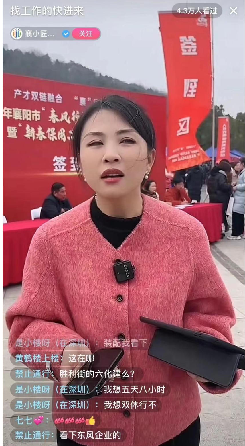 市人社局打造的“襄小匠探职场”官方抖音账号也在现场进行直播带岗,职位推荐官穿梭在各企业展位之间,和线上求职者进行交流互动,让更多的求职者足不出户便可“云上”了解现场招聘情况和企业需求,积极促成更多就业意向。据统计,直播间观看人次达4.3万,后台咨询人次1400余人,直播岗位报名400余人。
