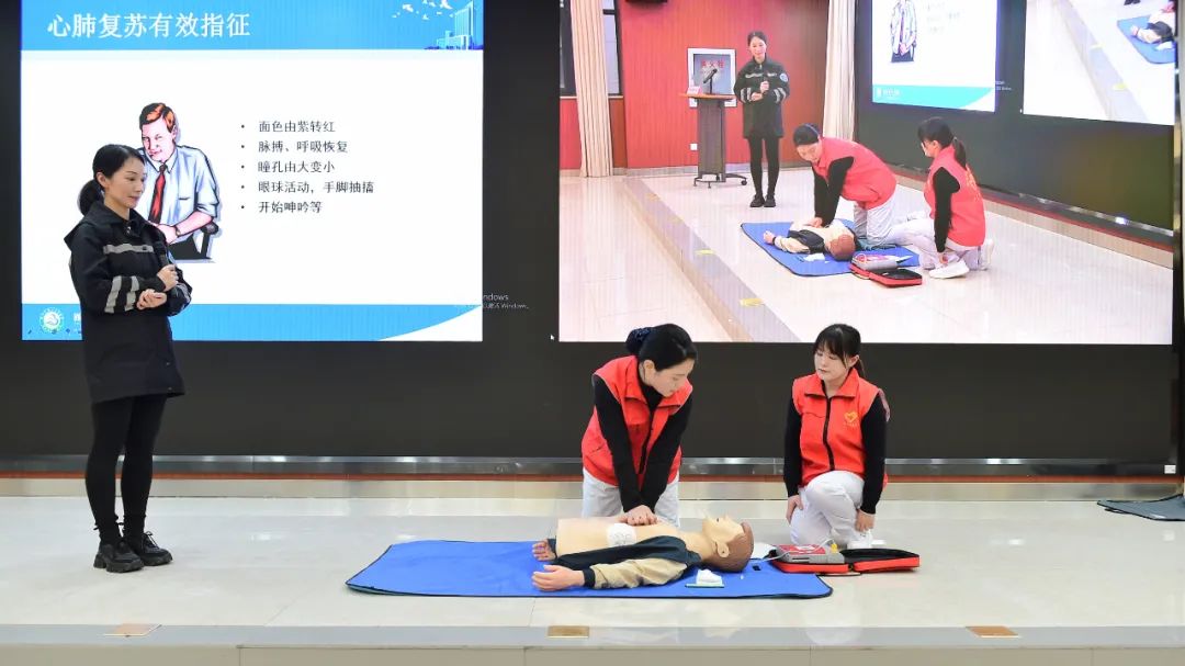 省第三人民医院肖芳应急救护志愿服务队为大家讲授心肺复苏等急救知识,现场演示了自动体外除颤器(AED)和心脏按压、开放气道、人工呼吸等急救技能的操作流程以及注意事项。